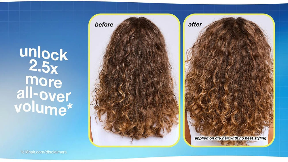A lightweight, buildable volume spray powered by K18PEPTIDE™ to reverse damage that depletes bounce in all hair types — especially fine, fragile, ageing + breakage-prone hair. This hair-fibre-thickening, non-sticky formula leaves hair looking and feeling fuller, delivering flexible volume that lasts up to 2 days — with or without heat styling on dry or towel-dried hair.*