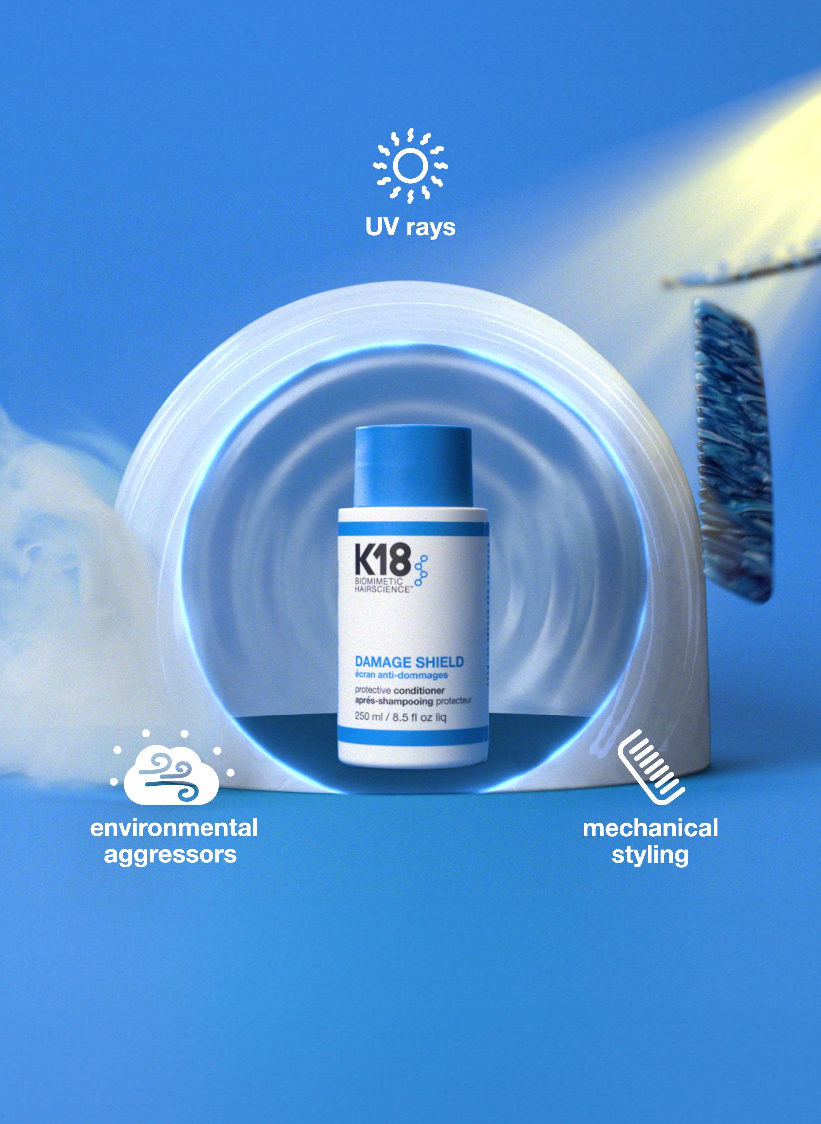 A nourishing, protective conditioner that shields hair from daily damage while improving smoothness, shine, and manageability. Formulated to weightlessly soften and detangle, while the K18PEPTIDE™ helps replenish hair with every wash. Provides up to 3 days of protection against UV rays, mechanical styling, and environemental aggressors.